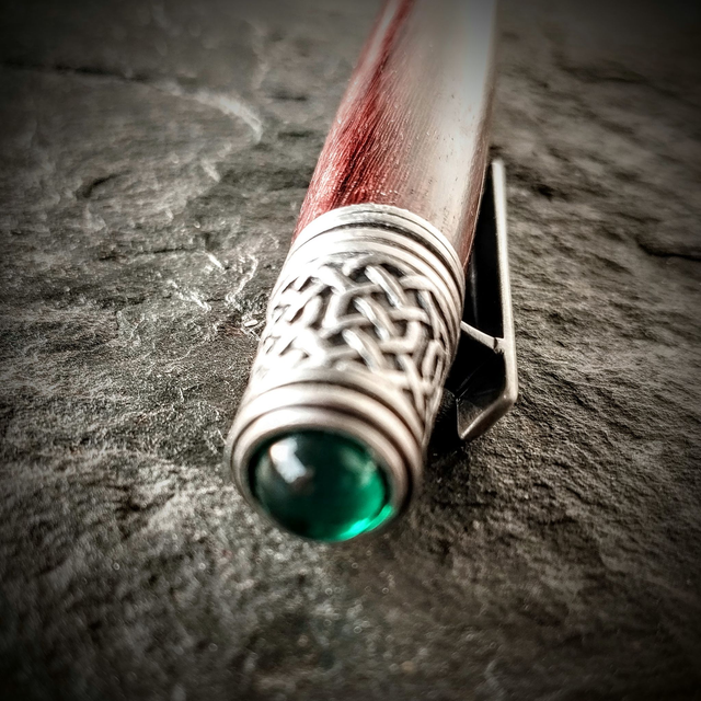 Pour tous les passionnés de la culture et de l'héritage Celtique. Le haut et bas du stylo sont ornés de nœud sans fins traditionnels. Un cabochon vert surmonte le haut du stylo.
