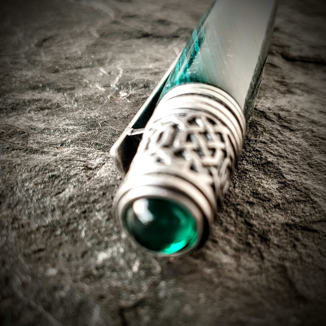 Pour tous les passionnés de la culture et de l'héritage Celtique. Le haut et bas du stylo sont ornés de nœud sans fins traditionnels. Un cabochon vert surmonte le haut du stylo.