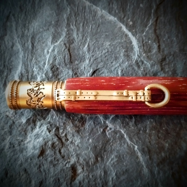 Un étrier, soigneusement détaillé avec sa bride, remplace la barrette du stylo.